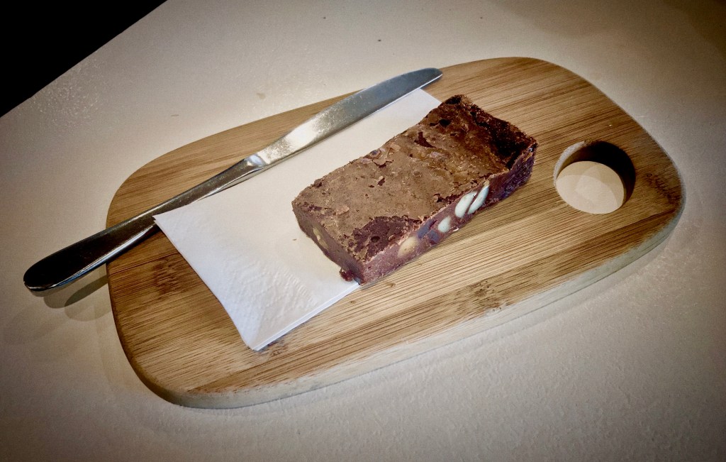 The brownie looks delicious and has been presented beautifully. The napkin, on the other hand, has been placed underneath the brownie, thereby soiling the napkin. The reason for this is unclear; a wooden board has already been used to support the brownie, so why must a napkin be placed beneath it? Surely the napkin could have been folded and placed neatly to the side instead. Would that have been so offensive?