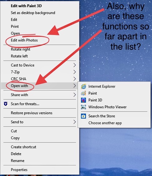 I couldn’t fit it easily in the mark-up but there’s even another separate ‘Edit with Paint 3D’ option! Why not ‘Edit with > Paint 3D, Photos’ etc.?!
