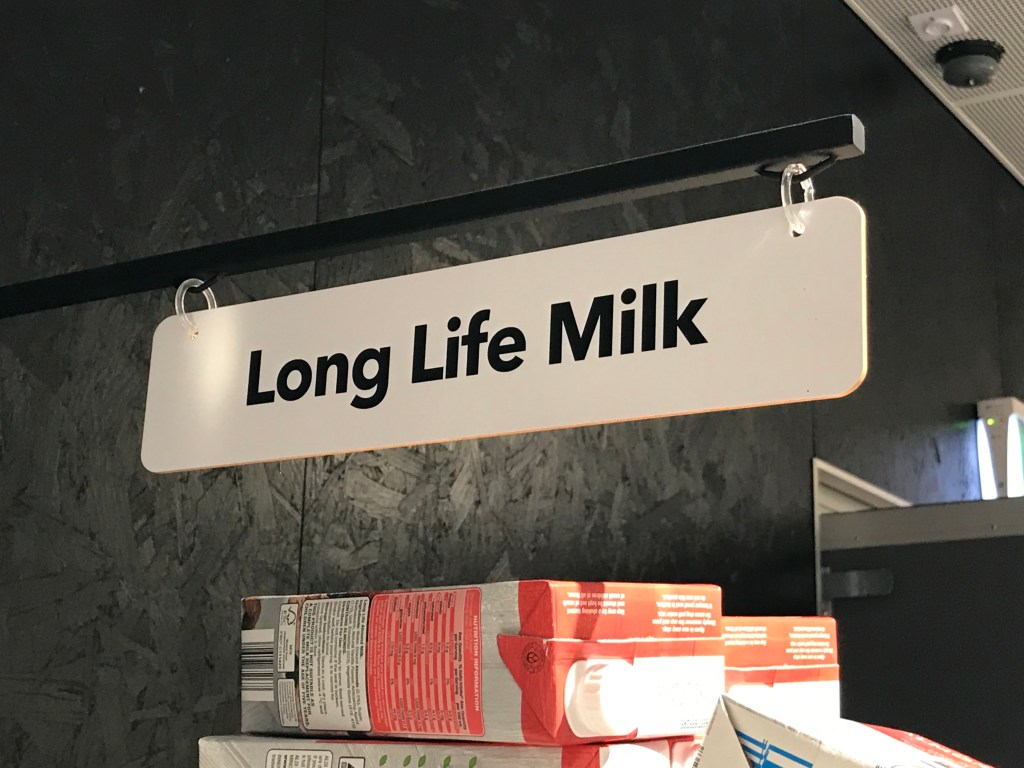 This should say ‘long-life milk’, however we’re either being asked to long for ‘life milk’, which must be the opposite of ‘death milk’, or the milk on display is somehow formulated to help us to live longer lives.
