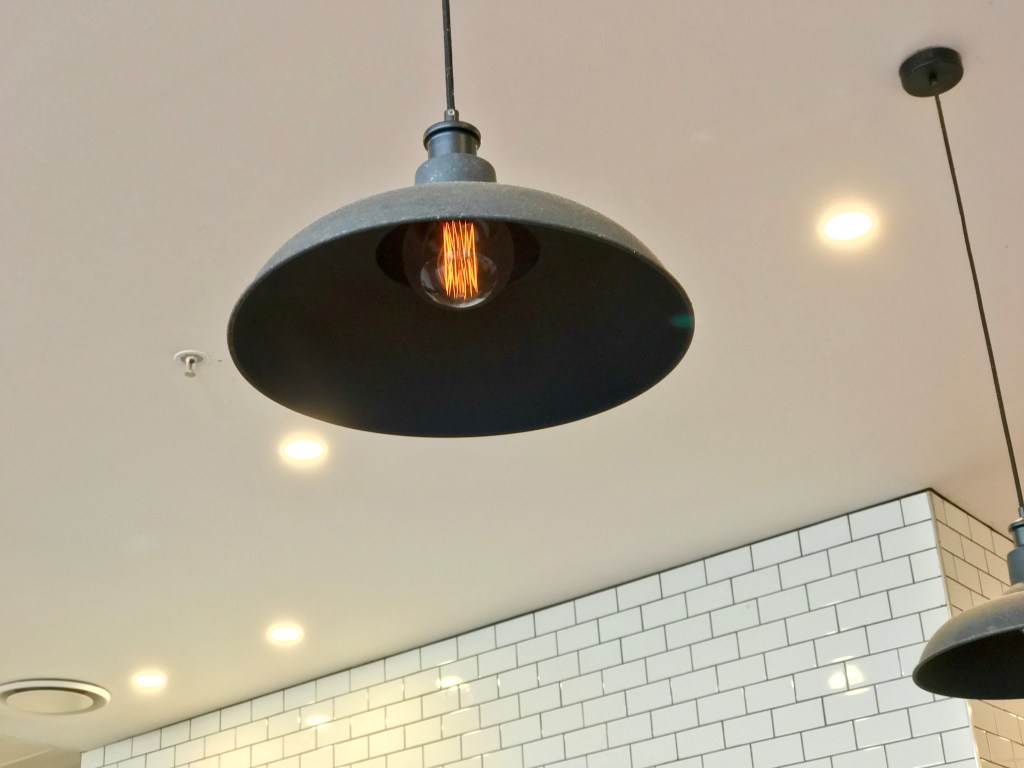 This photo was taken in daytime and you can see quite clearly that the hanging light is surrounded by many more downlights above it, which whilst not as fashionable, offer vastly superior illumination.