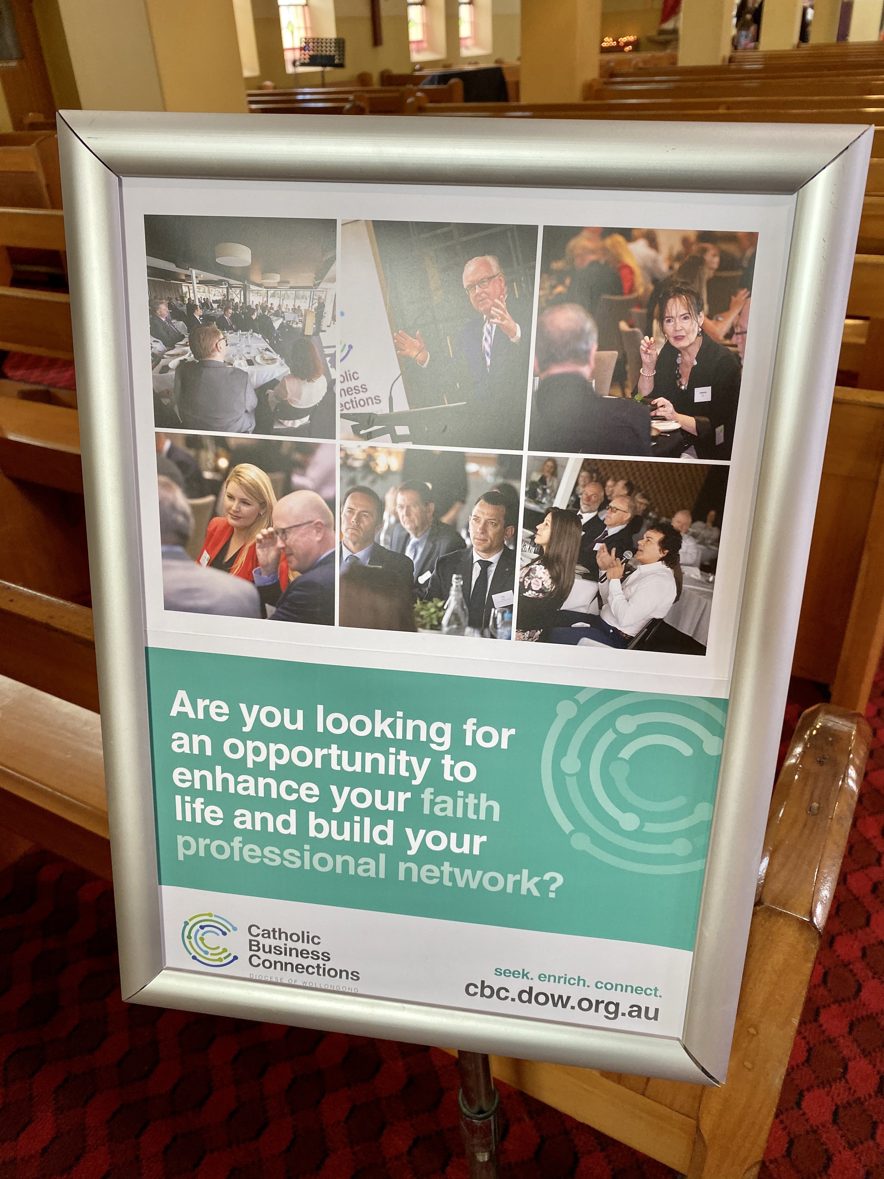 Beyond the evident focus on business, work and money, this sign also presented a bit of an issue with representation of the local Catholic community. The priest and all of his assistants and altar boys during the service clearly had Asian backgrounds. The attending parishioners were also very diverse in cultural background and dress. Every single person in this advertisement above for Catholic Business Connections appears to be a white Australian with presumably Celtic (or perhaps Anglo-Saxon) heritage. Clearly, the Catholic Diocese in Wollongong, which runs these business events, not only has an issue with the representation of diversity but also in understanding the very make-up of its own clergy and community. (Don’t even get me started on the thing that looks like a mullet coming out of the guy in the bottom-right image.)