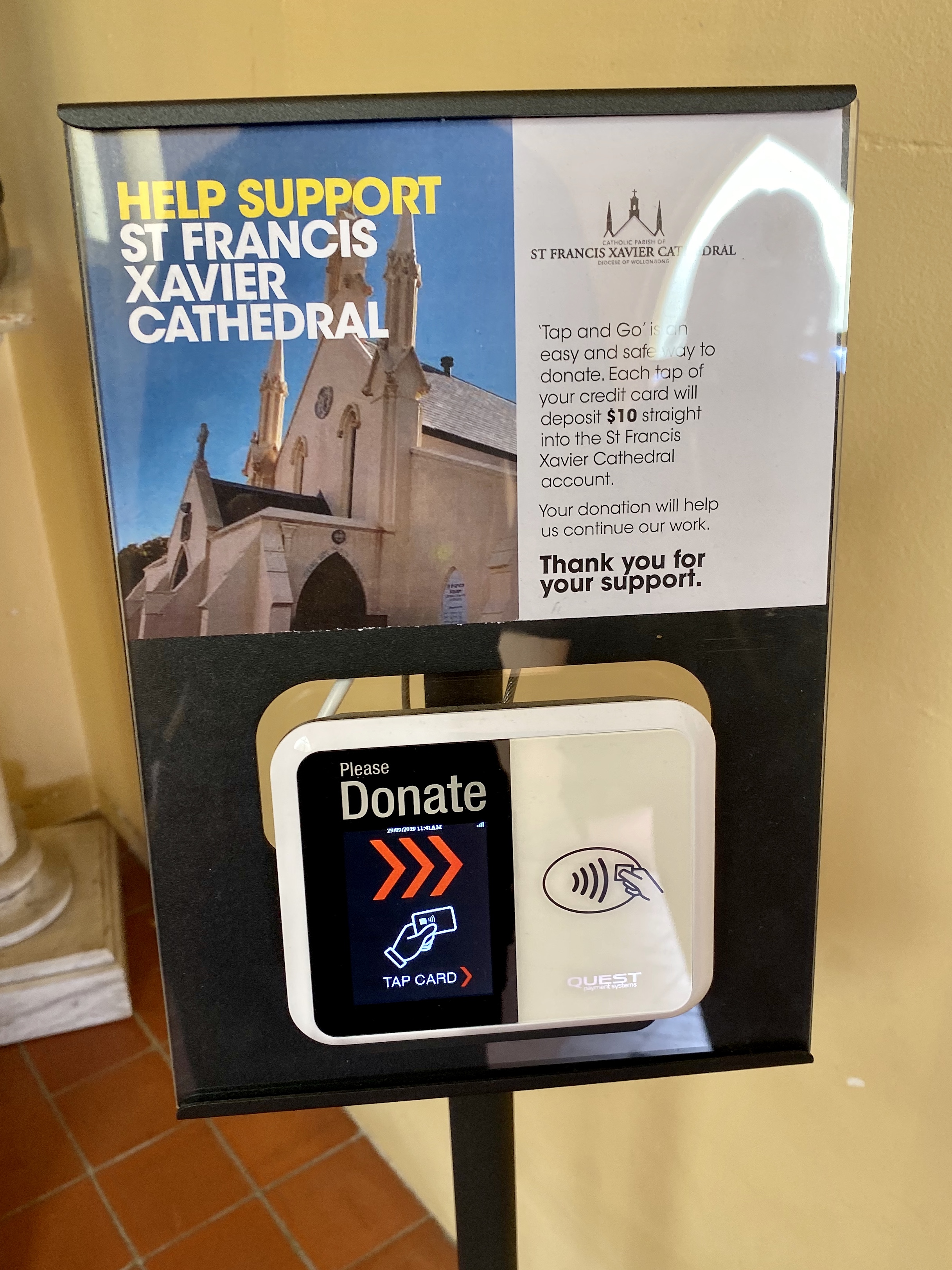‘Help support St Francis Xavier Cathedral. ‘Tap and Go’ is an easy and safe way to donate. Each tap of your credit card will deposit $10 straight into the St Francis Xavier Cathedral account. Your donation will help us continue our work. Thank you for your support.’